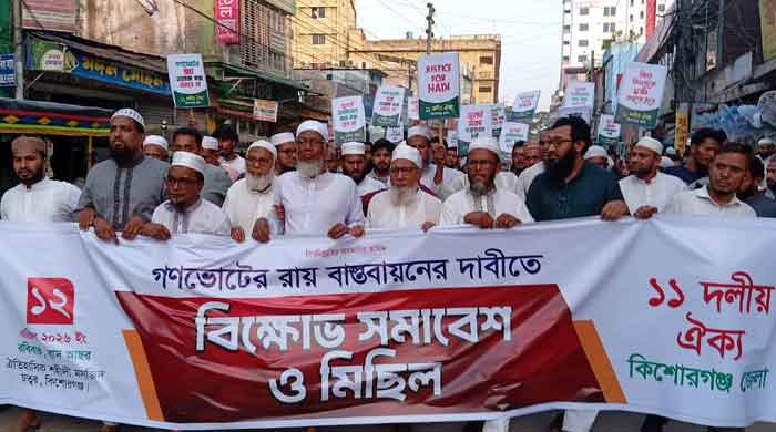 গণভোটের রায় বাস্তবায়নের দাবিতে কিশোরগঞ্জে ১১ দলের বিক্ষোভ মিছিল ও সমাবেশ